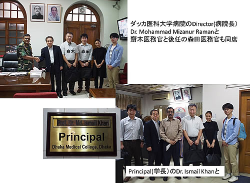 翌6月24日は、ホテルからダッカ医科大学形成外科へ向かい、Dr.Senらの出迎えを受けました。40名ほどのスタッフおよび研修医が集まる前で、8時半からレクチャーを約40分間行いました。その後、昼過ぎまで手術用顕微鏡が7台ほどあるMicrosurgical skill labで研修医向けの講習会を開きました。基礎練習を終えて、動物の血管を吻合するアドバンスコースとのことでした。ラットなどは手に入りにくいためか、入手容易なニワトリを使用することには少し驚きましたが、大腿動静脈の径は太く、吸入麻酔と抑制がうまくいけば吻合の練習には良いと思われました。血管吻合のデモンストレーションと指導を行いました。 ![]() ![]() 講習会の合間にDr.Rahmanと翌日の手術患者の選択と病棟回診を行いました。熱傷後瘢痕拘縮患者をリクエストしたところ、日本ではお目にかかれないシビアな拘縮患者が並んでおりました。関節部の拘縮はほとんど関節脱臼、変形を伴っており、熱傷受傷後、病院に来るまでに治療もせず数か月間~数年間そのままになっているようです。おまけに患者が多すぎて、大学病院でも治療が追いついていない様子でした。今後われわれが手術支援を行う余地は十分にありそうです。 訪問した時期は、ちょうど “ラマダン” (イスラム教徒の断食期間) の最中でしたので、昼間は医師、看護師そして患者さんの多くが食事をしない中、我々のために用意してくれたランチBOXをオフィスで食べた後は、Dr.HumayraとDr. Anwarulがダッカ医科大学キャンパス・市内観光に連れていってくれました。しかし、市内は人も車も無秩序の交通事情で渋滞がひどく、渋滞がなければ20~30分くらいで行きそうな距離も2時間以上もかかり、ほとんど狭い車の中にいました。夜は、ダッカ市内の高級レストランへ形成外科スタッフとラマダン明け (その日は18時53分) のディナーに行きました。かつて東京女子医大に留学しており、現在別の病院の教授になったDr.Ashrafも同席してくれました。 6月25日朝は、ダッカ医科大学病院で、外務省医務官の齋木先生にお会いしました。齋木先生には現地医務官としてこれまでJBMAの事業へのご協力など多大なるご尽力を頂きましたが、7月からコンゴに赴任することになり、アルゼンチンから赴任される後任の森田先生との引継ぎを兼ねての病院長および学長への挨拶回りに同行させて頂きました。